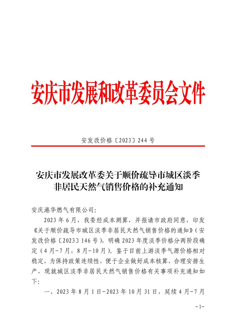 安慶市發(fā)展改革委關(guān)于順價疏導(dǎo)市城區(qū)淡季非居民天然氣銷售價格的補充通知