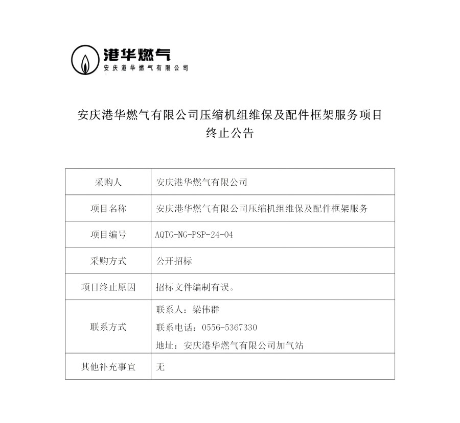 安慶港華燃?xì)庥邢薰緣嚎s機(jī)組維保及配件框架服務(wù)項(xiàng)目終止公告
