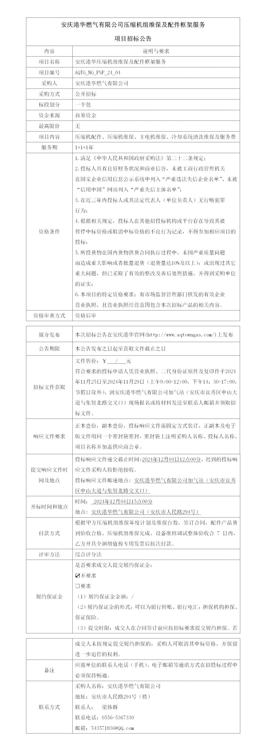 安慶港華燃氣有限公司壓縮機組維保及配件框架服務(wù)項目招標公告