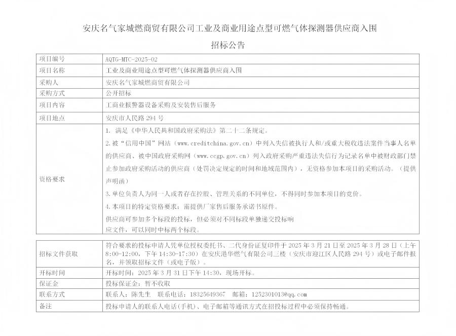 安慶名氣家城燃商貿(mào)有限公司工業(yè)及商業(yè)用途點型可燃氣體探測器供應(yīng)商入圍招標公告
