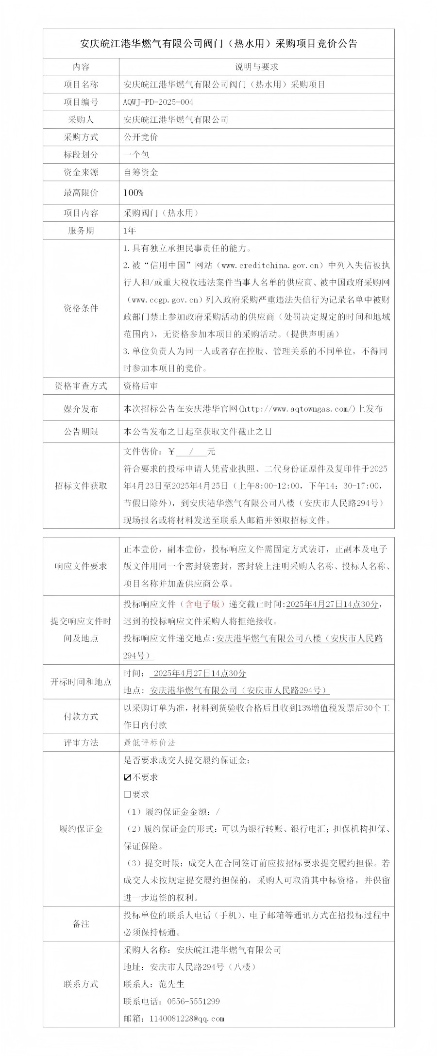 安慶皖江港華燃?xì)庥邢薰鹃y門(熱水用)采購項(xiàng)目競價(jià)公告