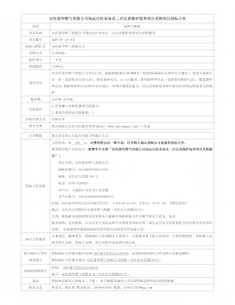 安慶港華燃?xì)庥邢薰緢?chǎng)站自控系統(tǒng)及二次儀表維護(hù)保養(yǎng)項(xiàng)目采購項(xiàng)目招標(biāo)公告
