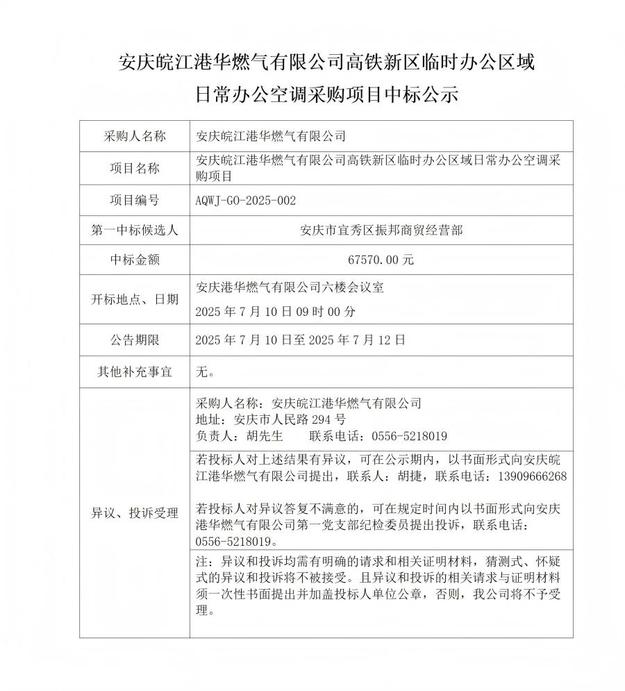 安慶皖江港華燃?xì)庥邢薰靖哞F新區(qū)臨時(shí)辦公區(qū)域 日常辦公空調(diào)采購項(xiàng)目中標(biāo)公示