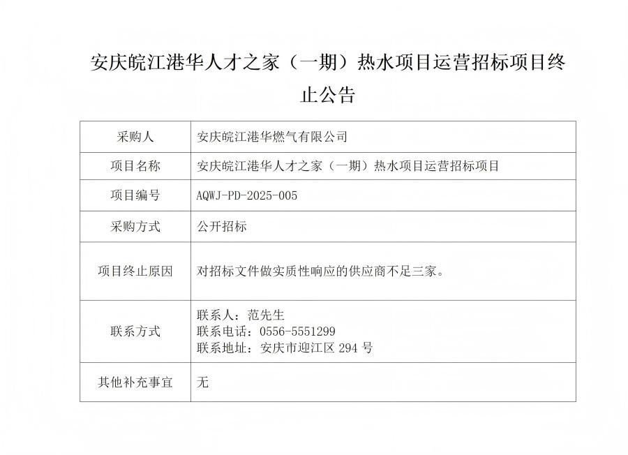 安慶皖江港華人才之家(一期)熱水項(xiàng)目運(yùn)營招標(biāo)項(xiàng)目終止公告