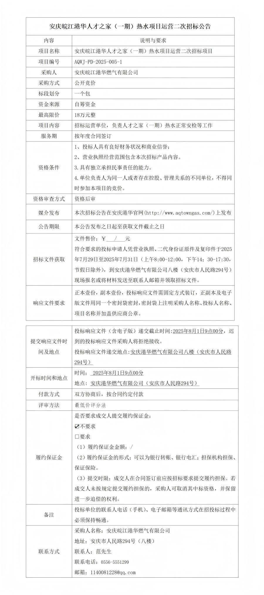 安慶皖江港華人才之家(一期)熱水項目運營二次招標(biāo)公告