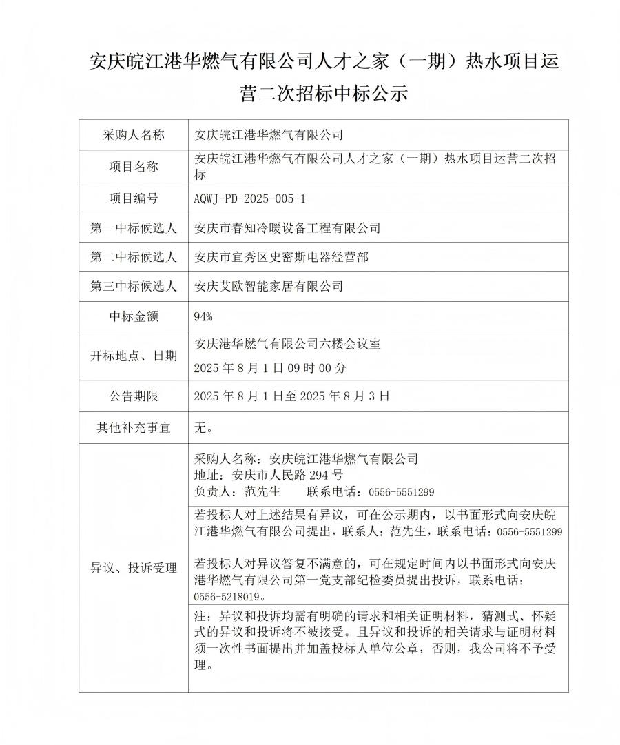 安慶皖江港華燃氣有限公司人才之家(一期)熱水項目運營二次招標(biāo)中標(biāo)公示