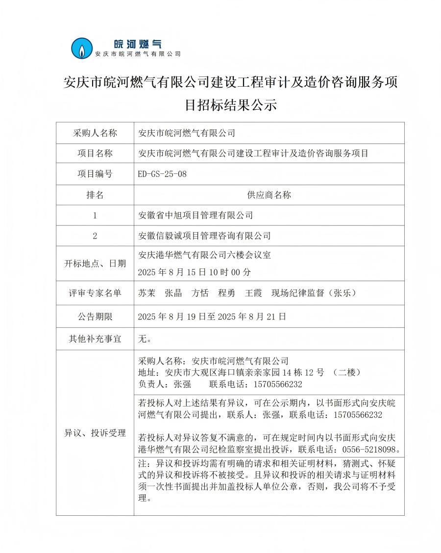 安慶市皖河燃?xì)庥邢薰窘ㄔO(shè)工程審計及造價咨詢服務(wù)項目招標(biāo)結(jié)果公示