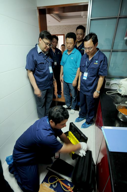 在安慶巡查的第三站——綠地迎江世紀城小區(qū),主要展示的是小區(qū)戶內(nèi)集中安檢。進入小區(qū),映入眼簾的是一排排安檢宣傳、咨詢、安全燃氣具展示區(qū),宣傳展板向居民展示燃氣安全使用知識、燃氣事故警示及安全燃氣具的使用等常識,工作人員細致耐心的解答居民的咨詢,并發(fā)放《燃氣客戶安全用氣手冊》。陳總裁等集團領導跟隨安檢員來到客戶家中,觀看戶內(nèi)安檢的每個環(huán)節(jié),當安檢人員規(guī)范地完成整個安檢流程后,陳總裁給予了“很好,不亞于香港水平”的高度評價。
